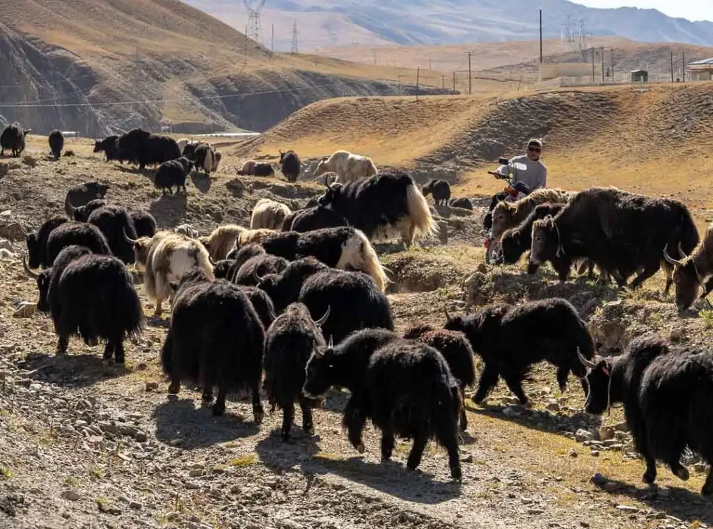 It’s our longest day on the road but there’s plenty of incredible scenery to see on the way. We encounter sheep, pass mountain ranges and of course, there’s a rolling yak roadblock enroute.