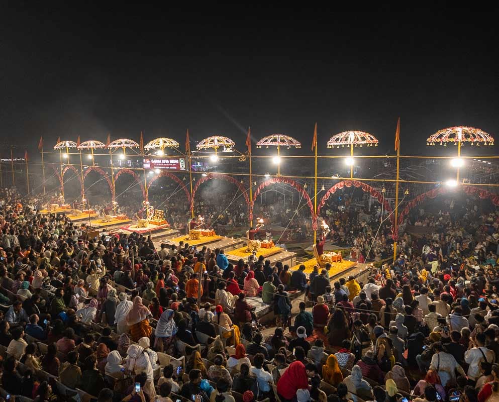 Incense drifts upwards from stalls below as aarti music and ghanta bells fill the air. The sound of conch shells spiralling through the night signals the beginning of the ceremony.