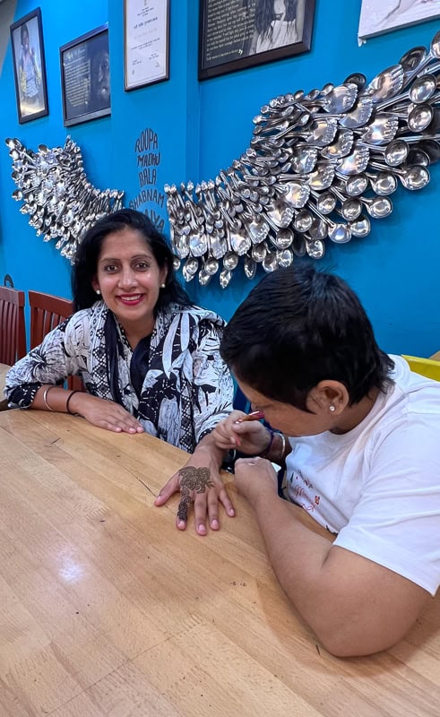 The women are warm and welcoming, the vegetarian food is delicious, and their resilience is inspiring. After lunch they share some of their personal stories as they create intricate henna designs on our hands. We buy some of the handicrafts on sale and learn about the steps India is taking to combat these attacks.