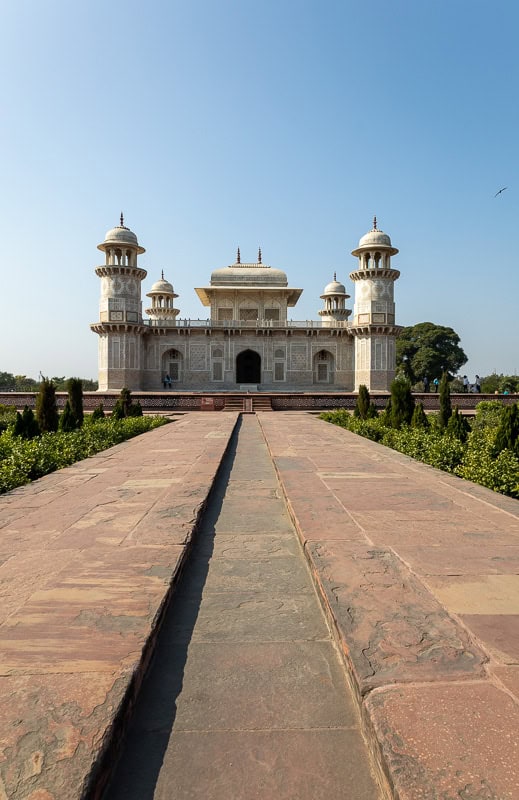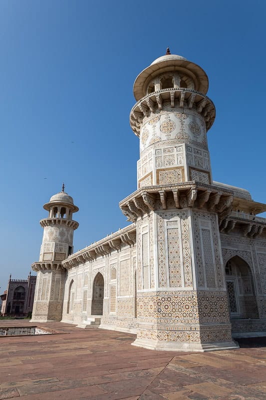 Our next stop is the Itimad-ud-Daulah tomb, often nicknamed the “Baby Taj”. Built in the 17th century and set within peaceful gardens beside the Yamuna River, its intricate marble inlay and delicate lattice work are actually more ornate than those of the Taj Mahal itself, just on a much smaller scale. And there’s barely anyone there.