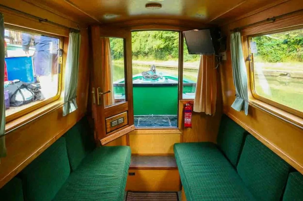 Our narrow boat bedroom at the bow of the boat had a fixed double bed with storage drawers beneath, shelves, plug sockets and hairdryer. Bedding was supplied and we slept really well. A door from our cabin led to the stern where the tiller is installed and the boat is steered from.