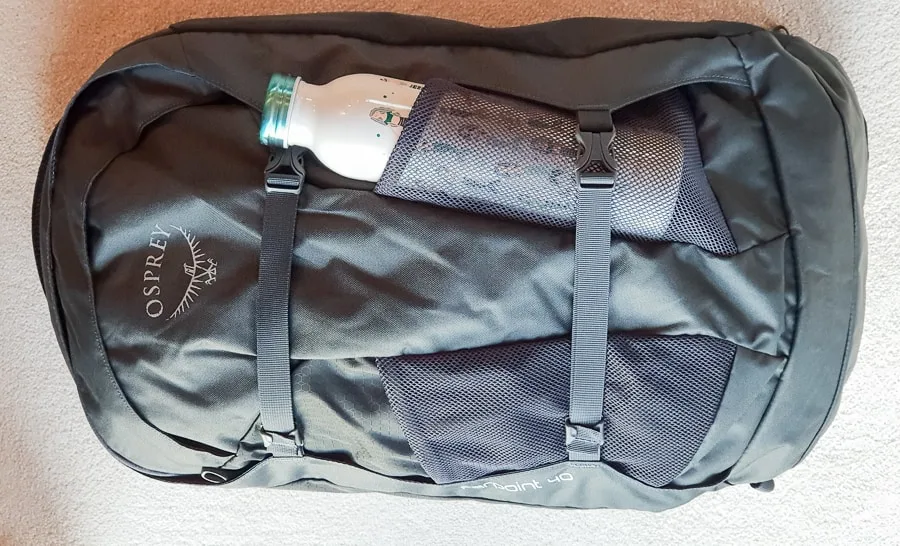 A smaller hidden pocket at the top is good for storing valuables. On the outside are two mesh pockets suitable for water bottle if the bag isn’t too full. These are also good for hooking things to. Two outside compression straps keep the bag neat.